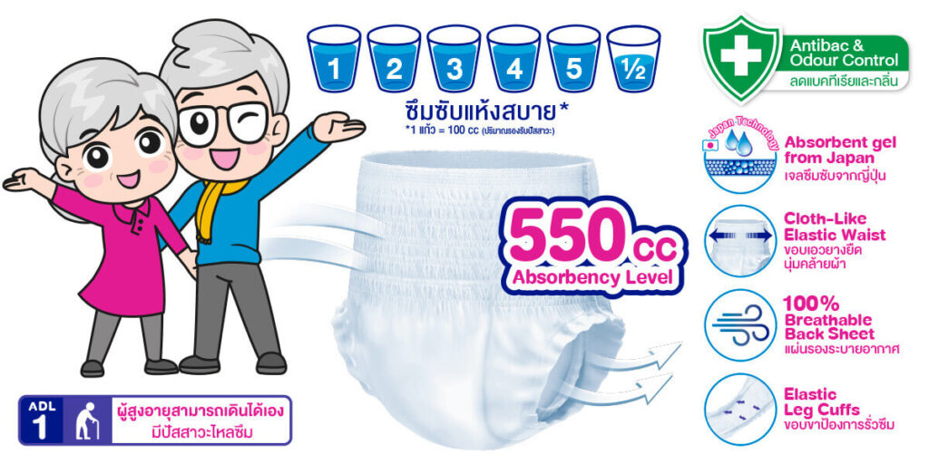 Adult Diapers Sannisoft pants can be used by both women and men. Available in sizes from M, L to XL, the elastic waistband is soft to the touch and snug-fitting around the waist and hips. Waterproofing leg edges with 100% breathable pads to help air ventilate and dissipate moisture. Provides a feeling of dryness, comfort, and refreshment.