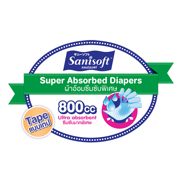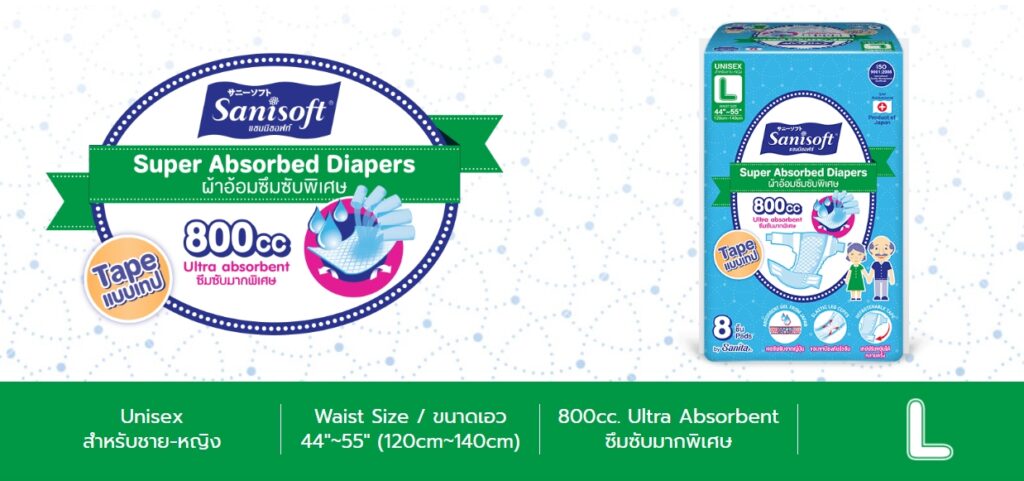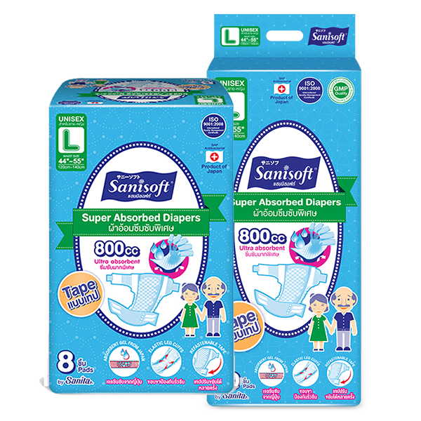 Product details of Sanisoft Super Absorbed Diapers Tape / Sanisoft Absorbent Adult Diapers 800cc Tape (Size L : 44-55 inches / 120-140 cm) 8 pcs/pack